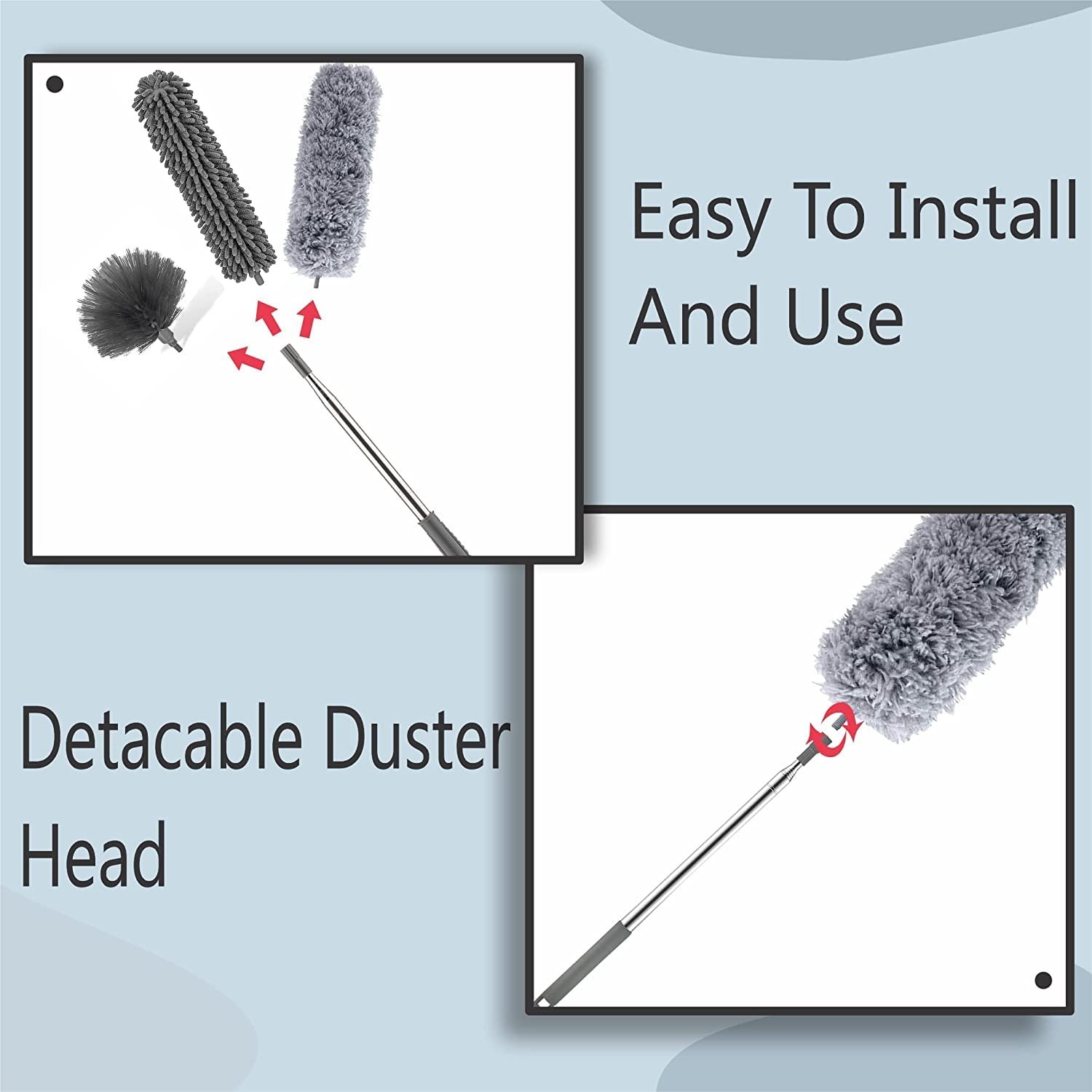 Microfiber head: dust collector electrostatic Absorbs dust, pollen and hair. Soft microfiber and soft rubber top ensure no scratching of sofa, furniture or wall surfaces during cleaning.Bendable and washable dust removal head:Removable microfiber cleaning head, easy to maintain, remove the cleaning head after use, wash the cleaning head with warm water, hang it in a dry and ventilated place to dry. Reusable, save your money.Housework is Easier:This cleaning duster with extension rod is easy to assemble and use, also no longer need a chair or ladder to help you reach high places, you can easily reach all kinds of difficult-to-clean places.