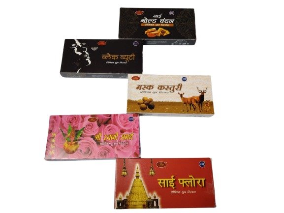 - DHOOP STICKS FRAGARNCE: Fragrance is always known for its long lasting and mesmerising aroma and in this pack it provides PREMIUM Gold Chandan , Black Beauty , Musk Kasturi , Rose , Sai Flora flavour fragrance which always had most important place while offering prayers from ancient time in India.