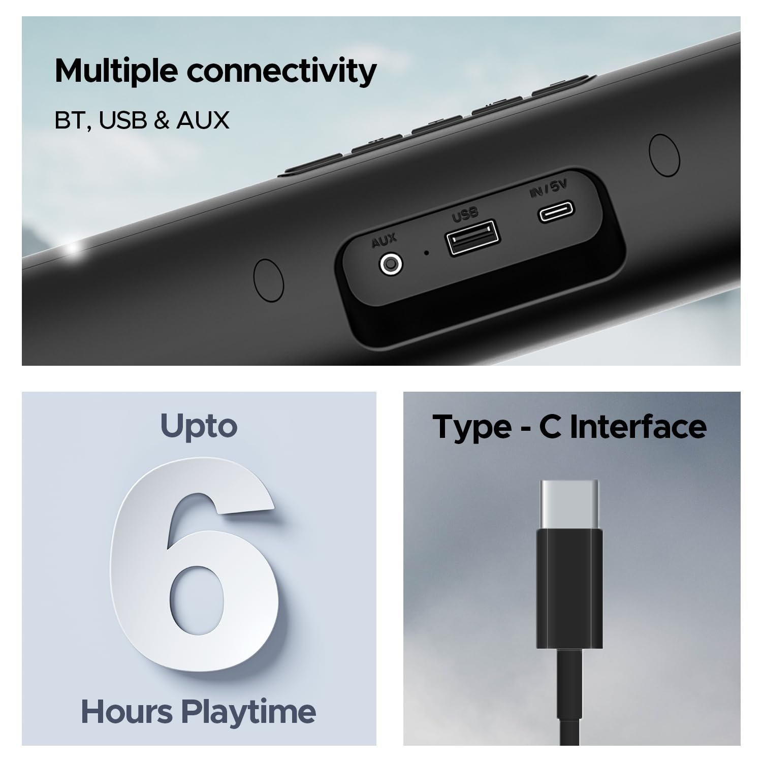 Multichannel Connectivity: Indulge in music with a host of wired connections, such as aux and USB ports, along with Bluetooth v5.0 wireless technology. So, you can plug into thumping beats however you want.; 6 hours of Playback: Host fun parties that raise the roof with enthralling music. The up to 6 hours performance of this soundbar gives you an ultra-groovy experience.