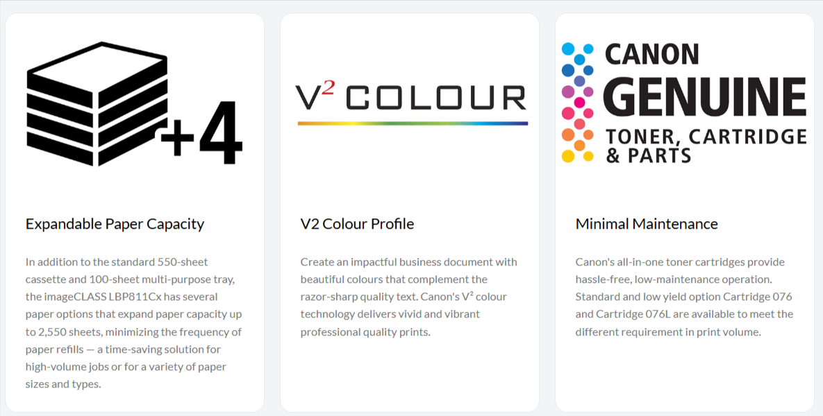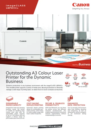 Enhance productivity in any business environment with the imageCLASS LBP811Cx. This versatile printer supports a variety of media sizes, allowing businesses to efficiently manage a wide range of printing tasks. An ideal choice to boost workplace productivity.