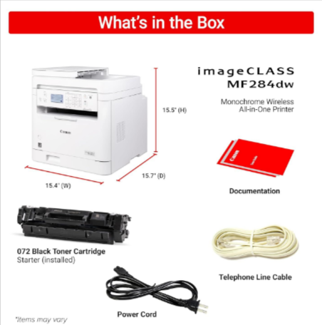 Brand: Canon Model no.: imageCLASS MF284dw Printer Type : Toner cartridge Printer Product: New Printer Cartridge color : Cartridge 072: 1,400 prints (bundled: 1,000 prints) Cartridge 072H: 4,100 prints Warranty : 1 Year or As Per Canon Service Center