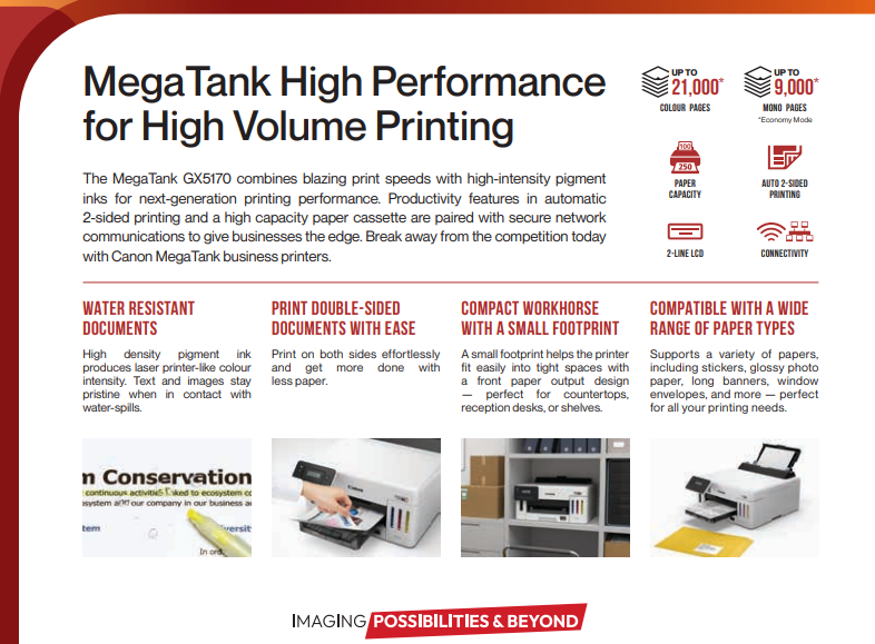 MegaTank for Business – High Performance for High Volume Printing The MegaTank GX5170 combines blazing print speeds with high-intensity pigment inks for next-generation printing performance. Productivity features in automatic 2-sided printing and a high capacity paper cassette are paired with secure network communications to give businesses the edge. Break away from the competition today with Canon MegaTank business printers.