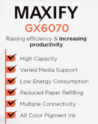 Brand: Canon Model no.: MAXIFY GX6070 Printer Type : Ink Tank Printer Product: New Printer Cartridge color : GI-76 (Pigment Ink/Black, Cyan, Magenta, Yellow) Warranty : 1 Year or As Per Canon Service Center