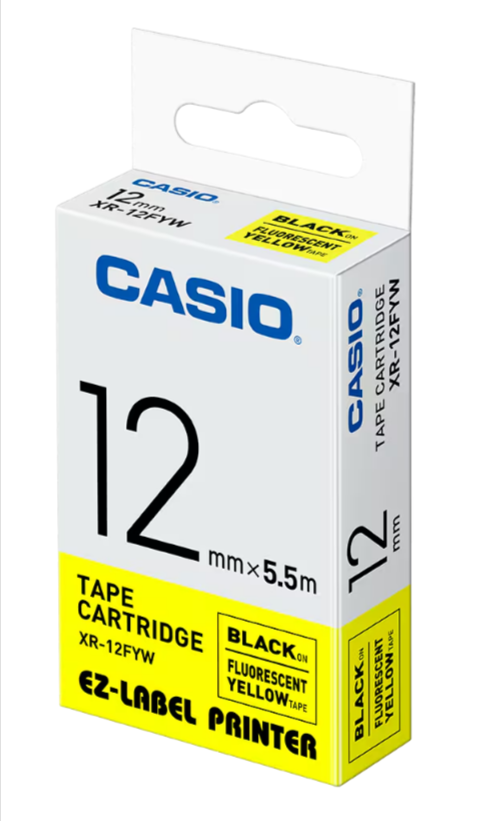 Fluorescent tape. Black text on fluorescent yellow. 12mm wide, 5.5m long.