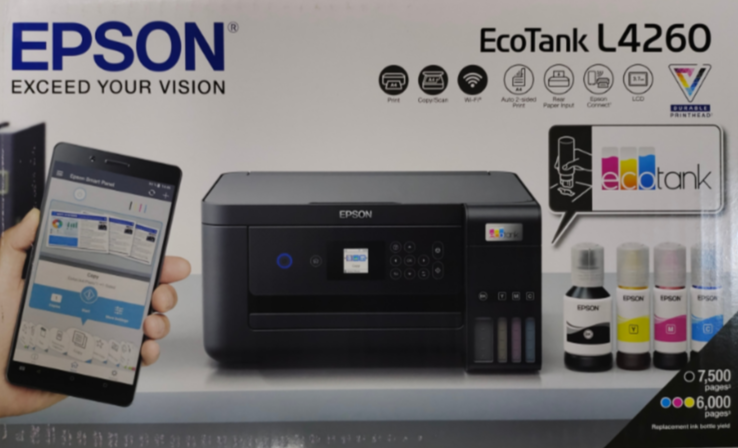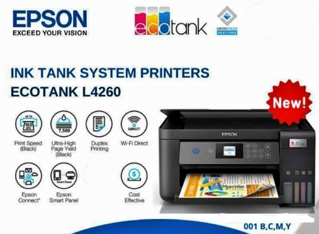Brand: Epson Model no.: Ecotank L4260 Printer Type : Ink tank Printer Product: New Printer Cartridge color : Black/Cyan/Yellow/Magenta Warranty : 1 Year or As Per Epson Service Center