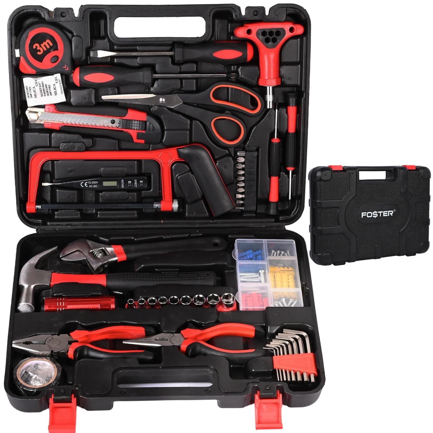 COMPREHENSIVE 100-PIECE SET: The toolbox includes a set of hex keys, scissors, a set of screwdrivers with 10 bits, a T-handle screwdriver, a utility knife, a claw hammer, a wrench, an LED torch, a hacksaw, a set of pliers, a set of drive sockets, a measuring tape, insulating tape, an assortment kit and a voltage tester.