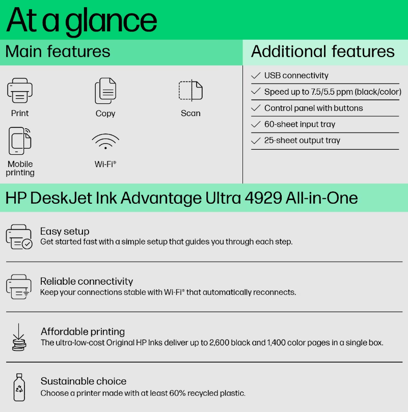 Brand: HP Model no.: Ultra 4929 Printer Type : Ink Advantage Printer Product: New Cartridge Colors: Black & Tri color Cartridge no.: HP 47 Warranty : 1 Year or As Per HP Service Center