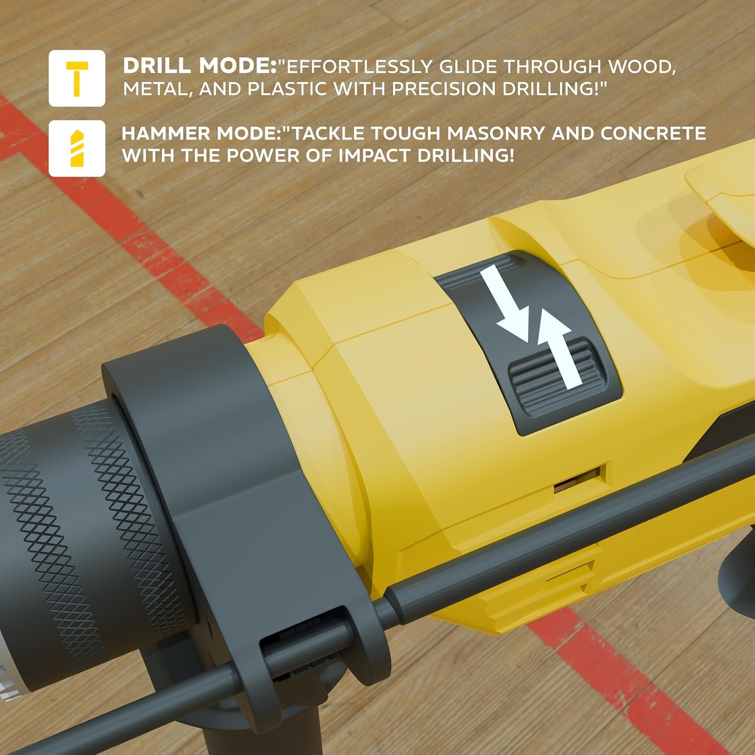 Dual Function Modes: Features both Impact Mode for hammer drilling into concrete and masonry, and Drill Mode for rotary drilling in wood, metal, and plastics. Includes reverse and forward rotation options for screwdriving and drill bit release.