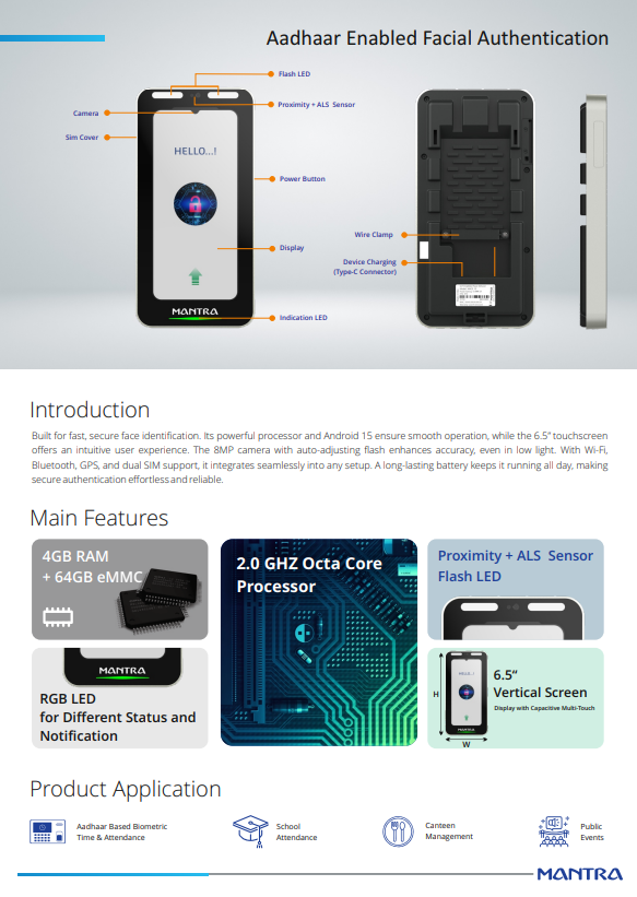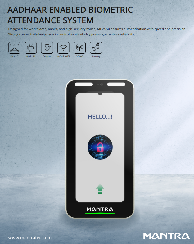 The MBAS50 is a compact, Aadhaar-compliant face recognition device designed to support AEBAS and other identity-based attendance systems. Engineered for accuracy, portability, and seamless integration, it empowers government and institutional sectors with secure and contactless authentication, anytime and anywhere.