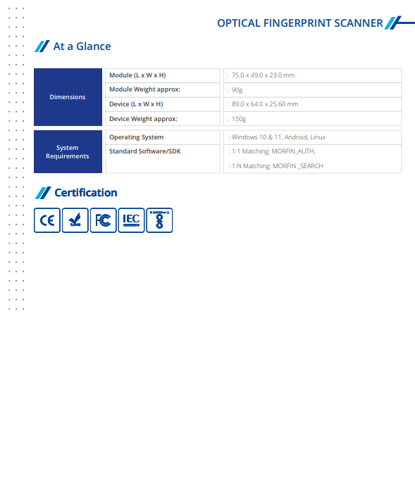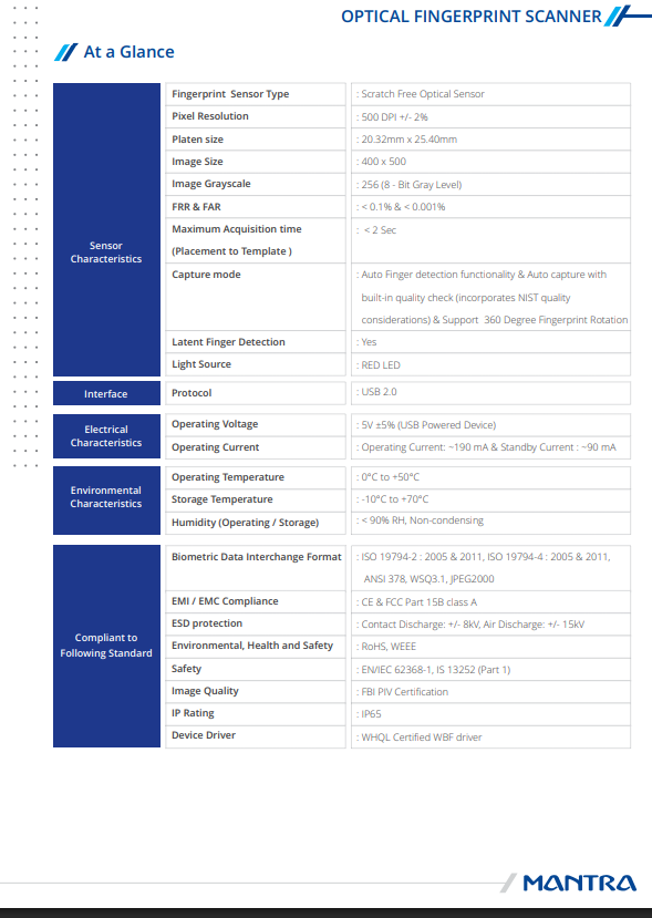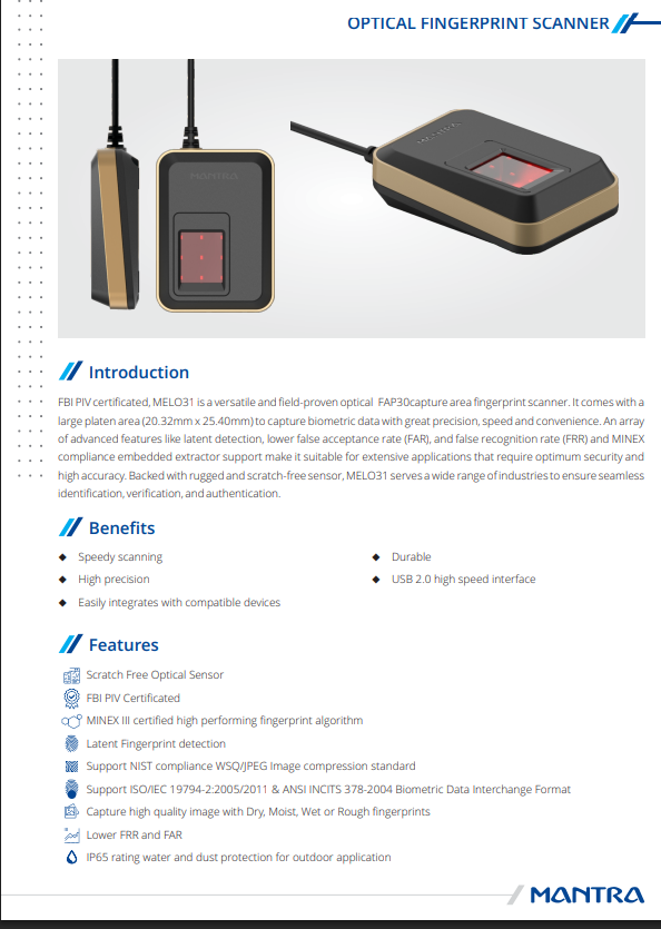 FBI PIV certificated, MELO31 is a versatile and field-proven optical FAP30capture area fingerprint scanner. It comes with a large platen area (20.32mm x 25.40mm) to capture biometric data with great precision, speed and convenience.