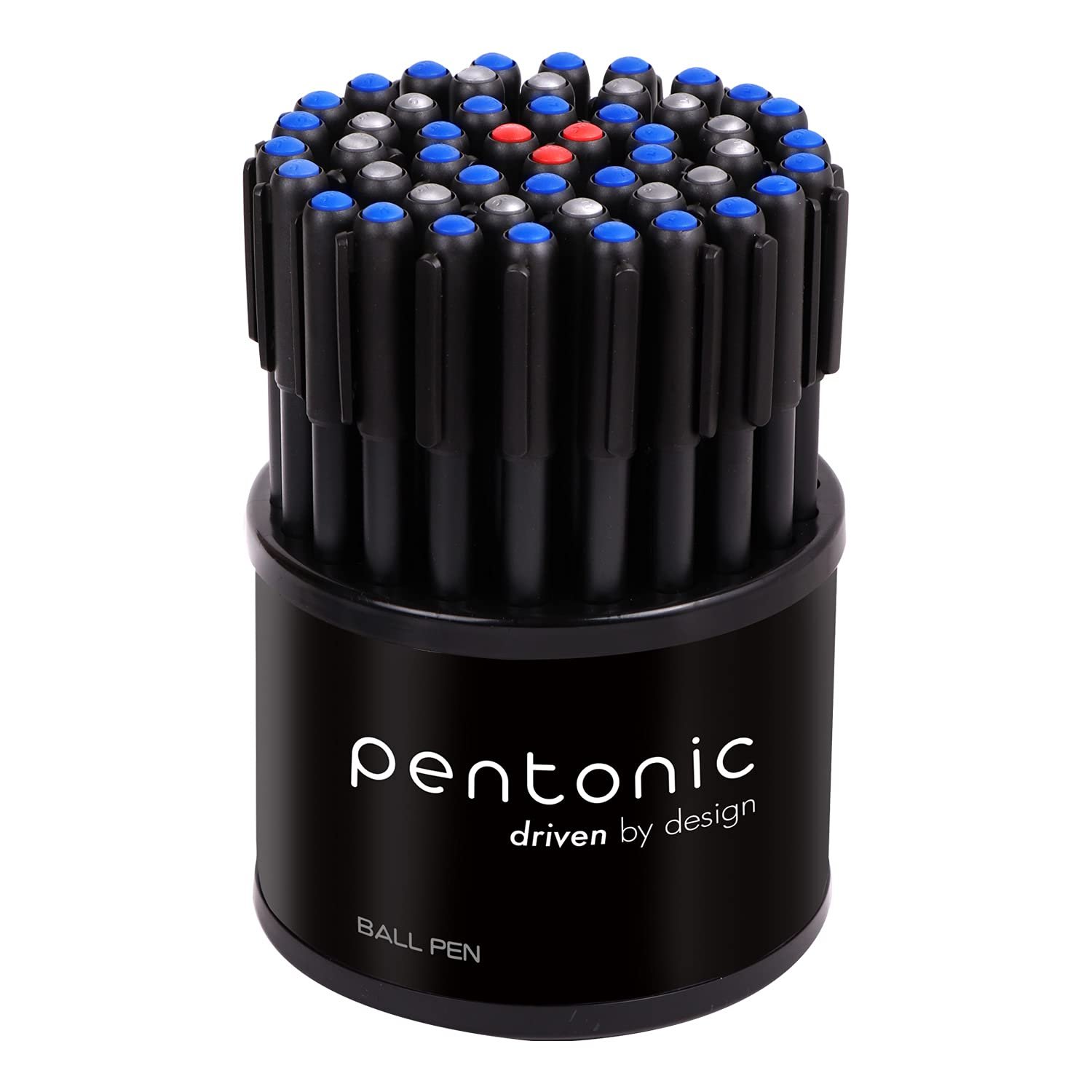 PACKAGE INCLUDES : Pentonic Ball Pen Tumbler Pack. Ink Color: 32 Blue Ink, 15 Black Ink & 3 Red Ink, Body Color : Black, Tip Size: 0.7 mm, Click-Off Mechanism, 50 Pieces Pens.