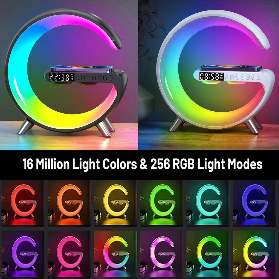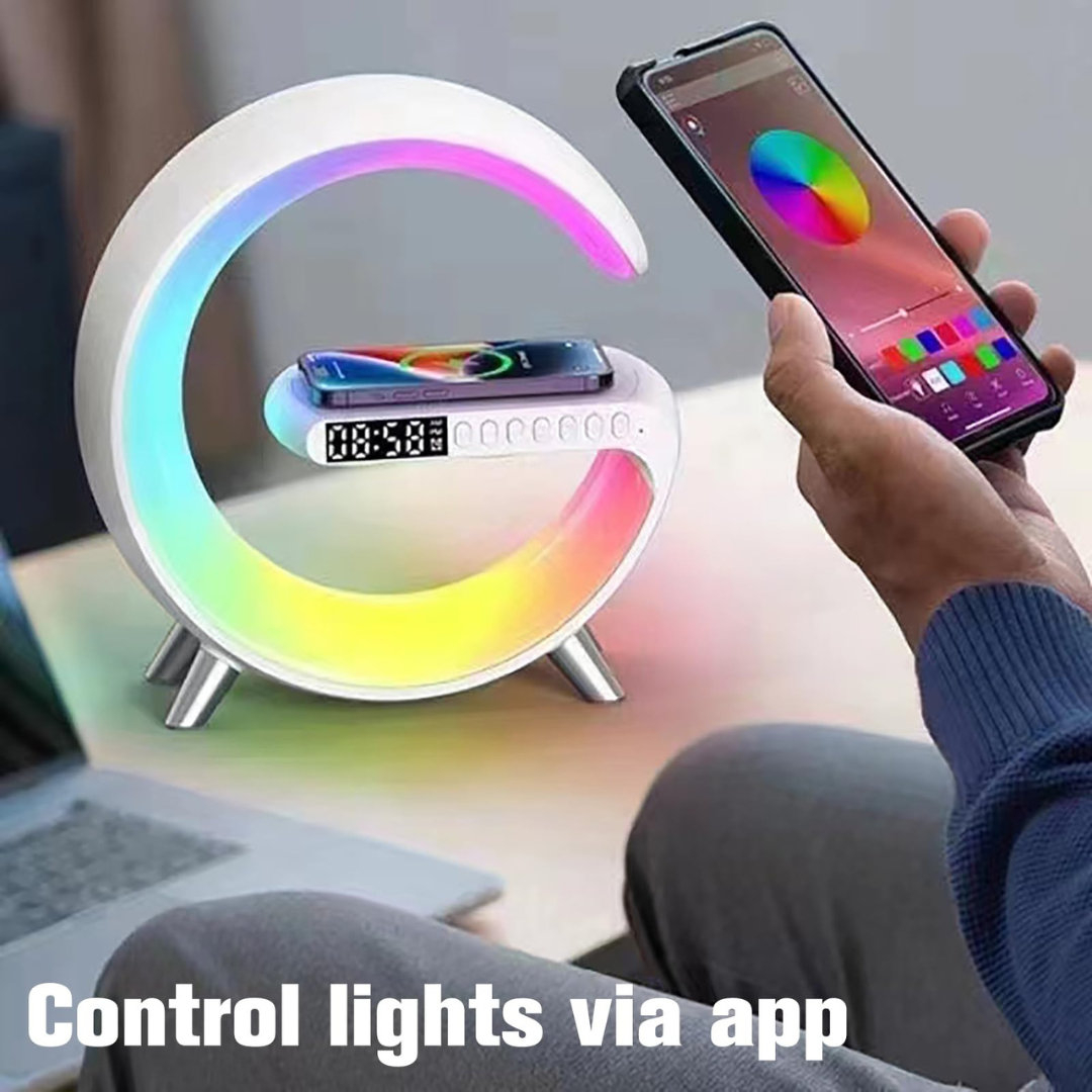 Multifunctional Smart Atmosphere Lamp: Features a 15W wireless charger, RGBIC smart lighting, alarm clock, and Bluetooth speaker, perfect for enhancing your bedroom or room décor.