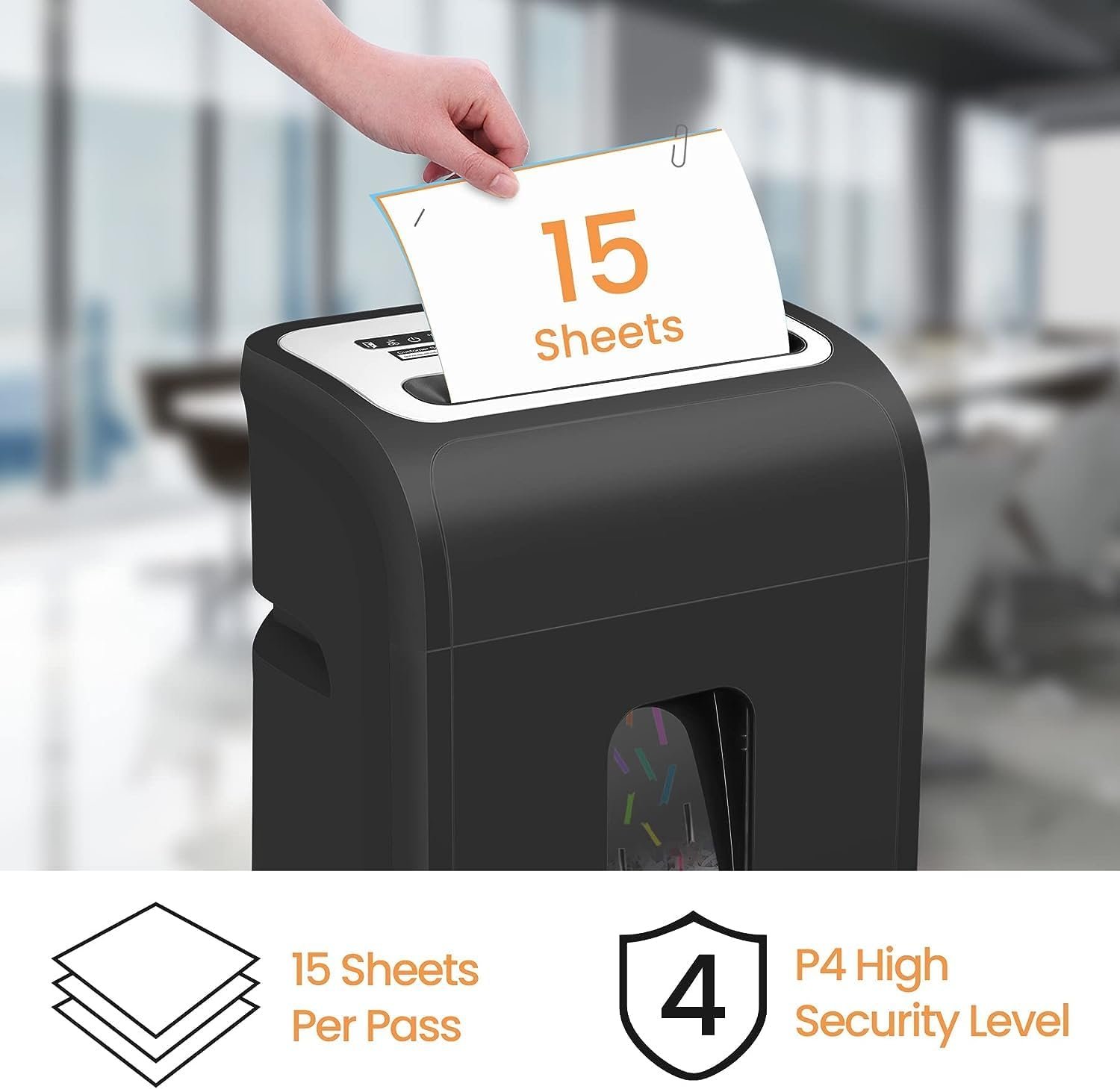 15 Sheet Cross Cut Paper Shredder: Particle cut shredder machine with 15 sheet shredding capacity, no need to remove staples or clips, shreds paper into tiny particles of 4 x 38mm, security level P4, destroys credit cards (one at a time).
