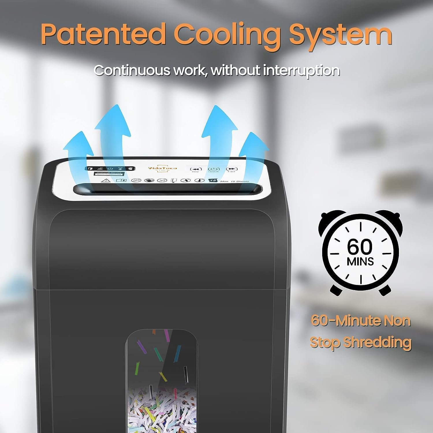 60 Minutes Extra Long Working: Paper shredders heavy duty with patented cooling system, this paper shredder offers an extra fast shredding speed with 60 minutes of continuous operation. After a 60-minute cool-down cycle, it can be used again.