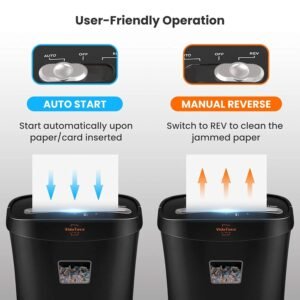 - Easy Operation: The paper shredder has 3-mode control switches (Auto, Off, Reverse); Auto start/stop and manual reverse functions simplify shredding and paper jam clearing processes, releasing you from the frustration of jamming.